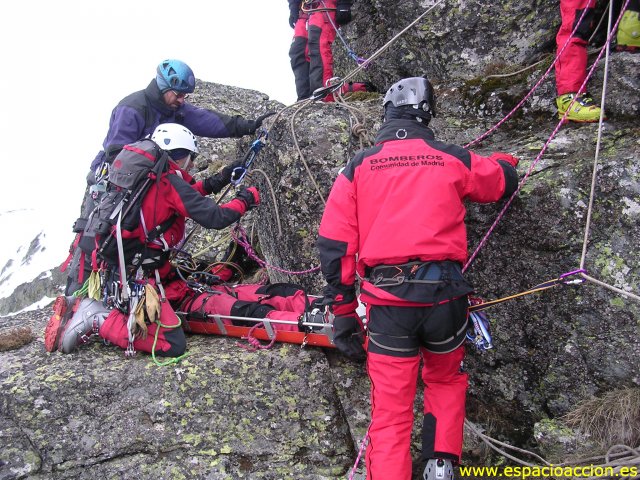 Curso para auxiliares de grupos de intervención en montaña. Como técnicos sanitarios o grupos logísticos de apoyo que deban intervenir en rescates en paredes en el medio natural. Técnicas de seguridad y movimiento por cuerdas con equipo ligero.